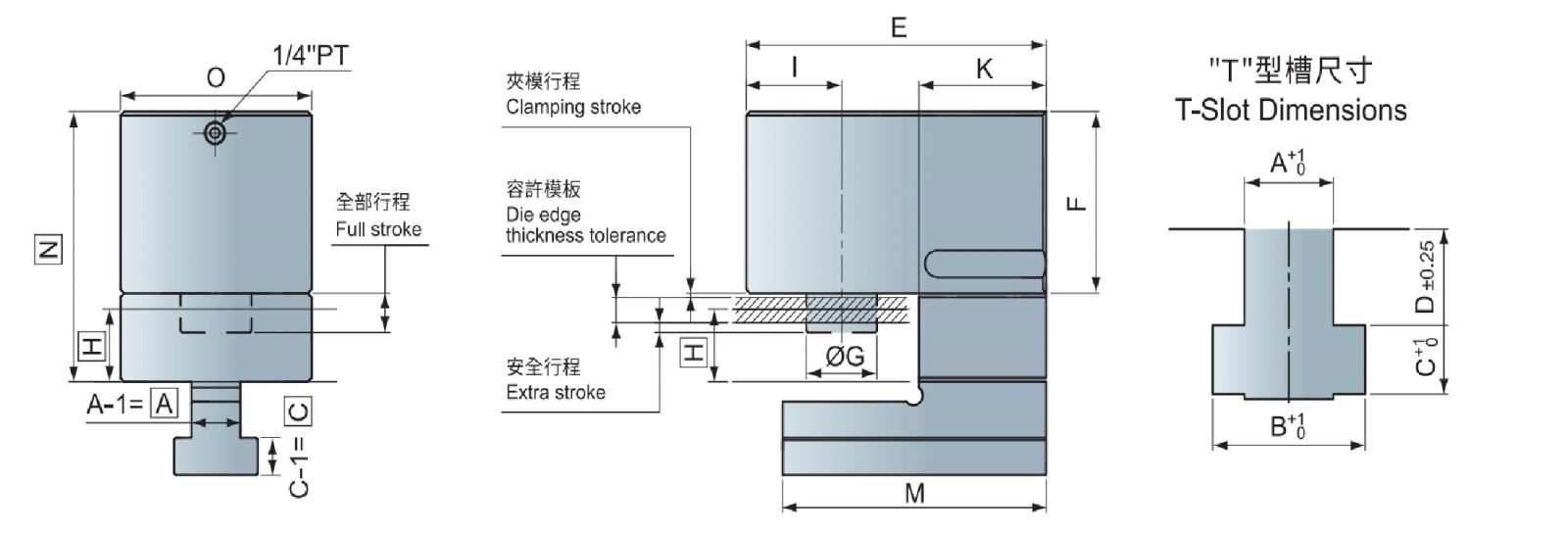 This vertical type clamp does not required a U-slot on the die shoe.The clamping stroke will be longer.