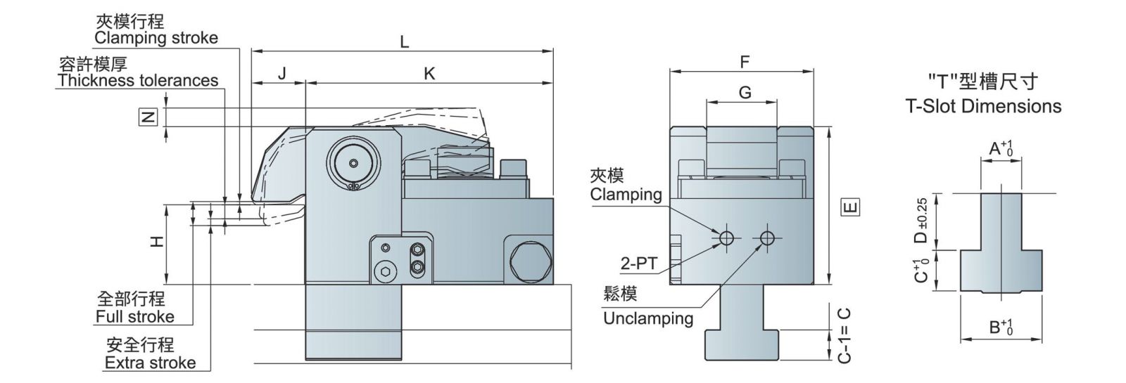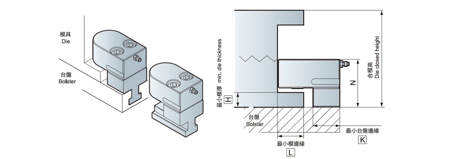 This vertical type clamp does not required a U-slot on the die shoe.The clamping stroke will be longer.